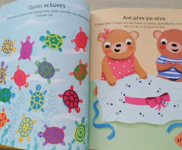 Είναι ένα βιβλίο με πάρα πολλές δραστηριότητες όπως λαβύρινθους, αριθμο-παιχνίδια, σύγκριση εικόνων, παιχνίδια παρατήρησης, αντιστοίχισης κ.α. που θα χαρίσουν ευχάριστες και δημιουργικές ώρες στα παιδιά μας, ενώ είναι και μια πολύ ωραία πρόταση για δωράκι!