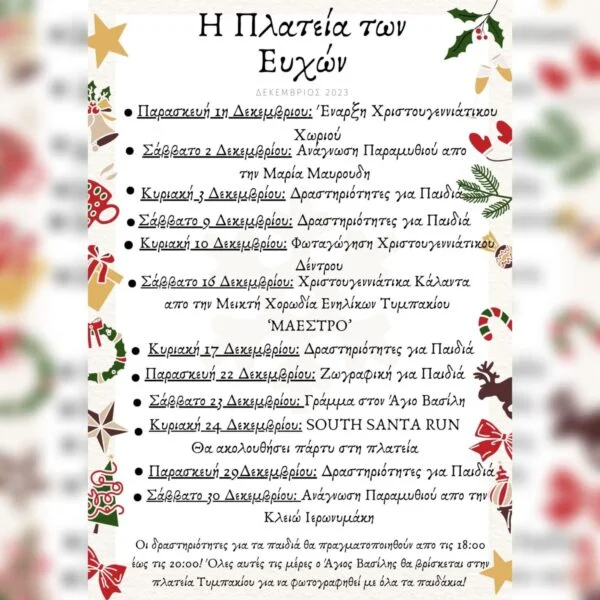 “¨Η πλατεία των ευχών¨ και θα ισχύσει για όλο το μήνα Δεκέμβριο.Θα λειτουργήσουν επίσης ξύλινα σπιτάκια και σπιτάκι με Άγιο Βασίλη που θα βγαζει φωτογραφίες με τα παιδιά. Θα χαρούμε να σας έχουμε κοντά μας σε αυτή μας τη προσπάθεια με σκοπό να κάνουμε τα Χριστούγεννα στις καρδιές των μικρών μας φίλων μοναδικα και φωτεινά.