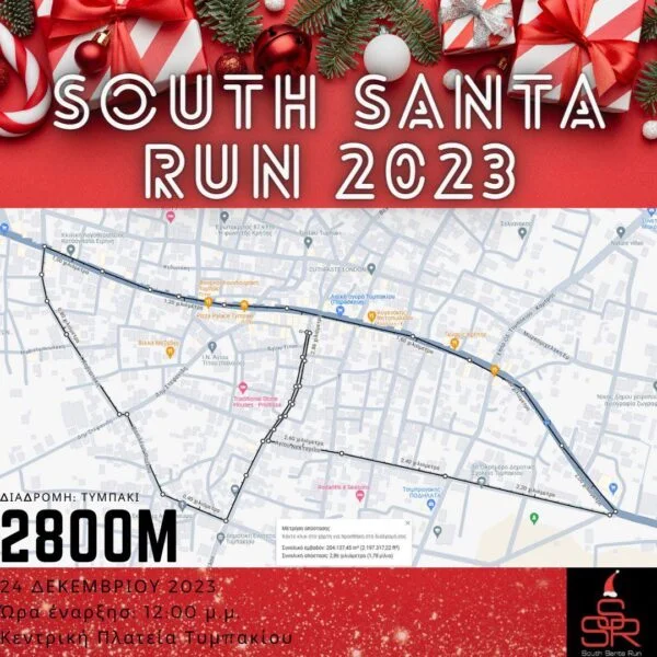 Ακόμη, σας επισυνάπτουμε στη διαδρομή του 1ου SOUTH SANTA RUN που θα λάβει χώρα στις 24 Δεκεμβρίου στις 12 μ.μ και θα είναι μια διαφορετική διοργάνωση που ελπίζουμε να γίνει θεσμός. Θα ντυθούμε όλοι μαζί μικροί, μεγάλοι Αγιοβασίληδες εκείνη την μέρα και θα τρέξουμε μια μικρή διαδρομή σε όλο το Τυμπάκι με αφετηρία και τερματισμό την πλατεία μας. Κοστος συμμετοχής για ενήλικες 10 ευρώ( ηλικίες 10 ετών και άνω) και για μικρούς 7 ευρώ (ηλικίες 5-9) Δηλώσεις συμμετοχής έως 17 Δεκεμβρίου.”