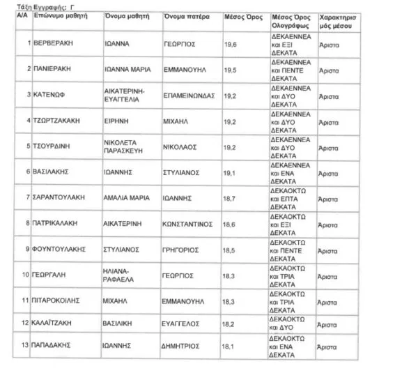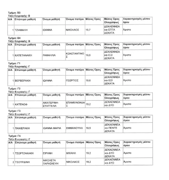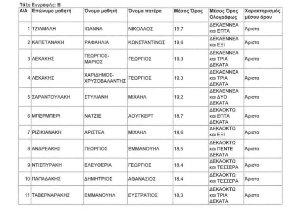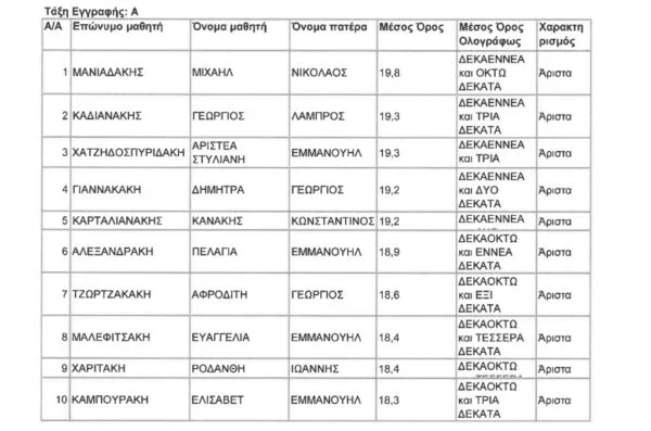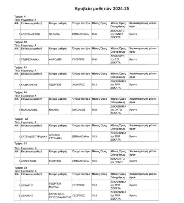 Ανακοινώθηκαν οι αριστούχοι μαθητές του Λυκείου Τυμπακίου για τη σχολική χρονιά 2024-2025. Αριστεία μαθητών Τάξη Α’ Αριστεία μαθητών Τάξη Β’ Αριστεία μαθητών Τάξη Γ’ Βραβεία μαθητών Α’, Β΄ και Γ’ Λυκείου Μοιραστείτε: Share on Facebook Share on Pinterest Share on X (Twitter) Share on Email