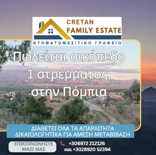 Πωλείται οικόπεδο 1 στρέμματος, στην Πόμπια Δήμου Φαιστού Σε μία ήσυχη και προνομιακή τοποθεσία, πωλείται οικόπεδο 1 στρέμματος στην όμορφη … Περισσότερα