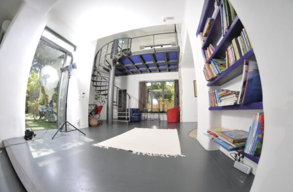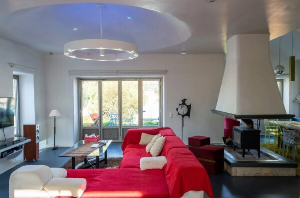 -Ενιαίο καθιστικό–τραπεζαρία με θόλο και κρεμαστό τζάκι