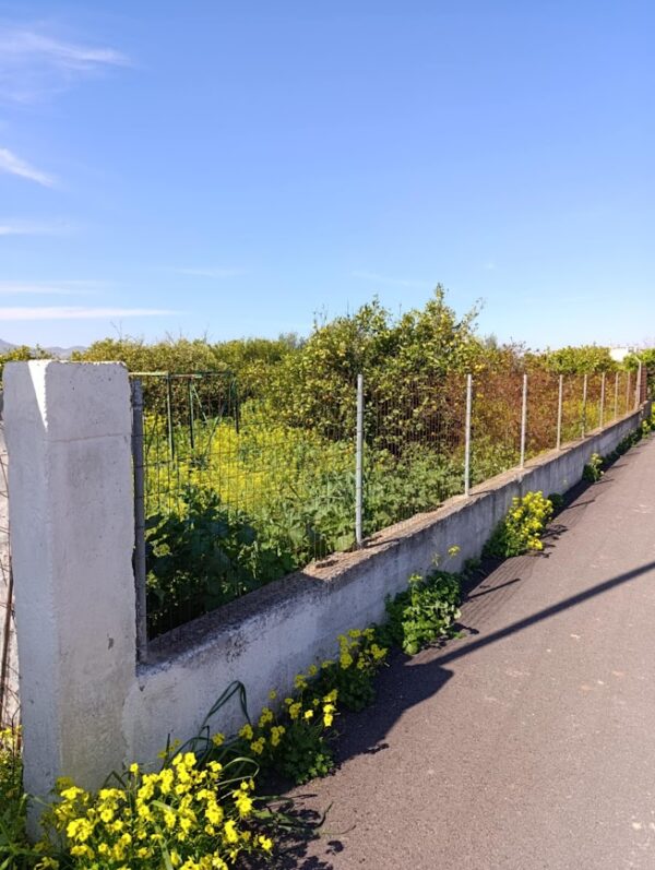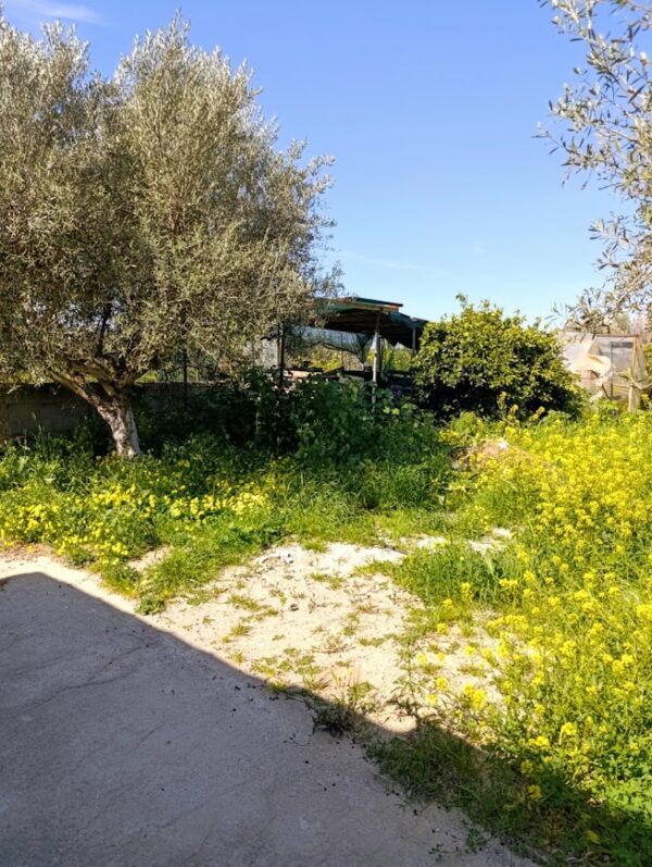 Outdoors, there is a courtyard with a pergola, ideal for relaxing moments, while the plot includes olive trees, lemon trees, orange trees, and mandarin trees.